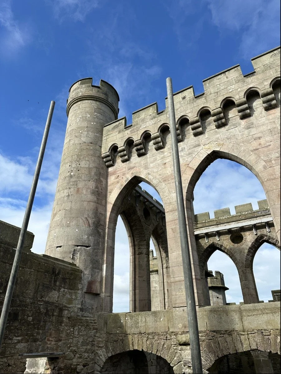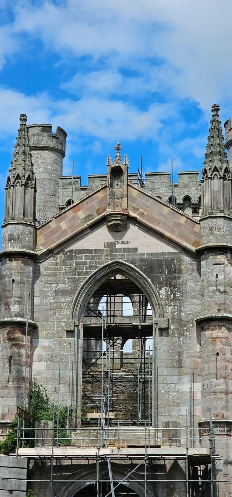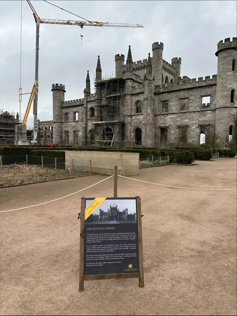 We were invited by Lowther Estate to assist with the rebuilding of the south central gable pinnacle. The pinnacle had collapsed several years earlier but a lot of the original stone fragments had been retained on site. With works to preserve the listed building and reinstate the silhouette of the castle over the last 20 years, this marked a significant milestone, being one of the last pieces on the central section of the castle to be repaired.